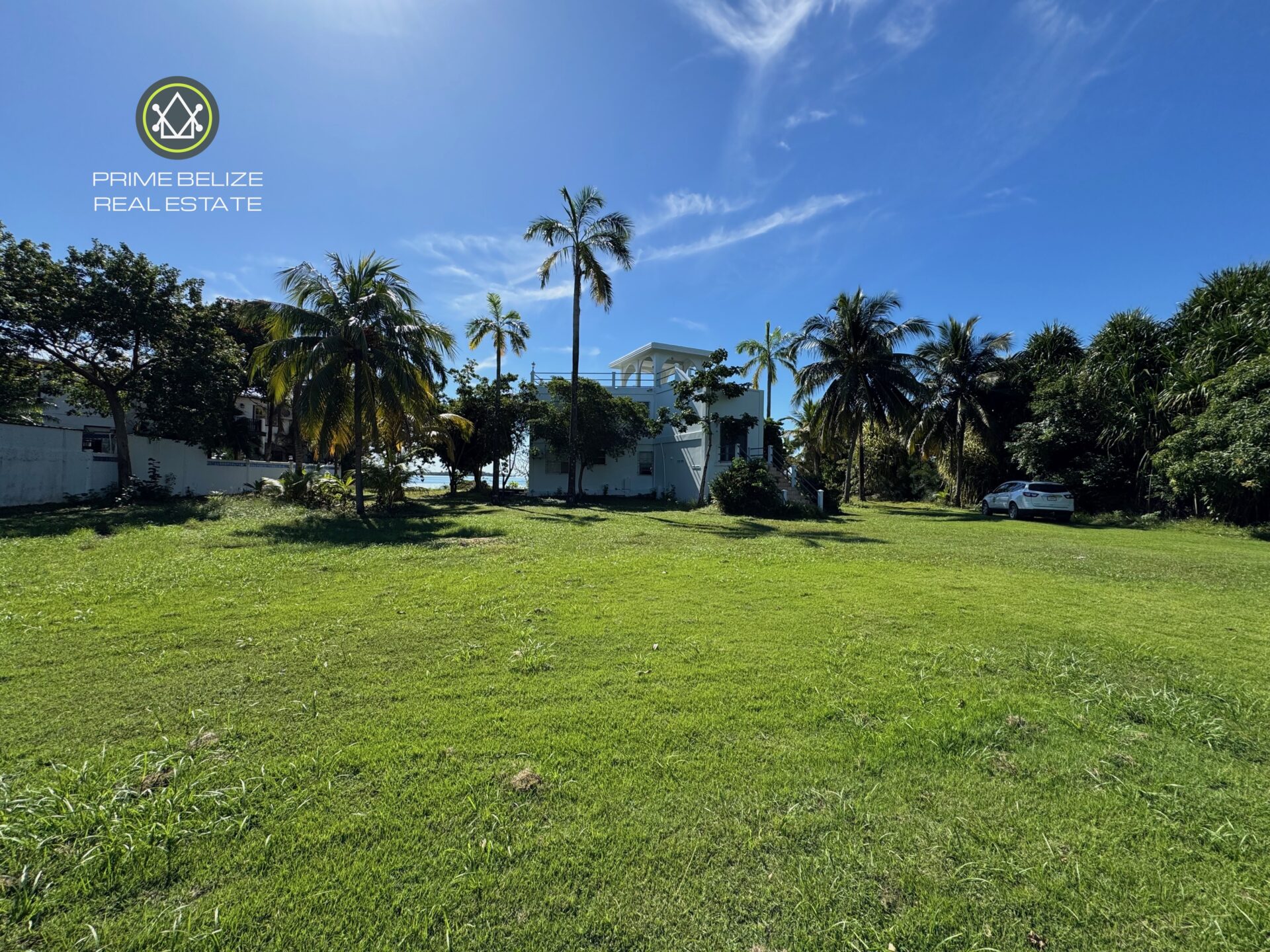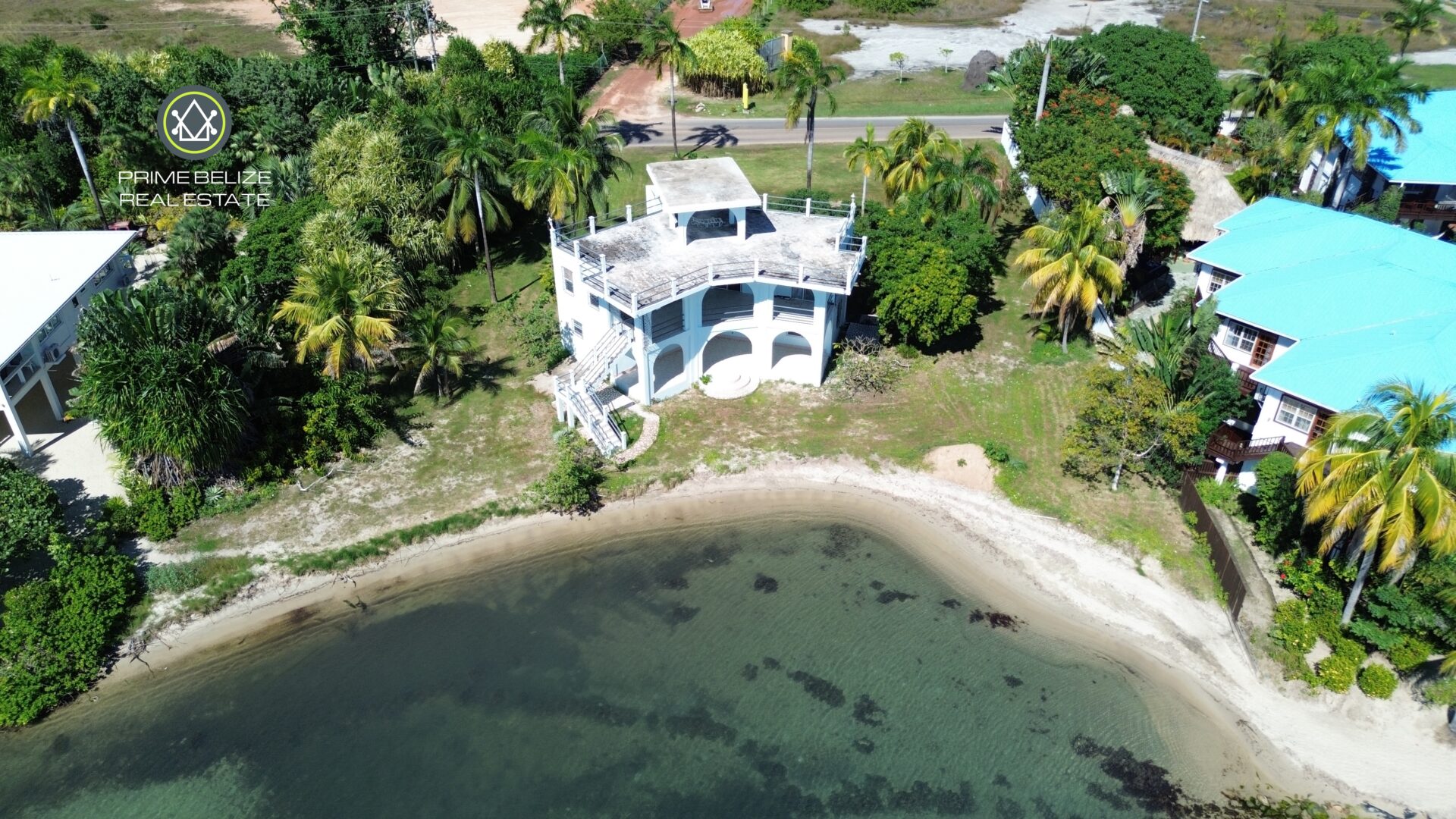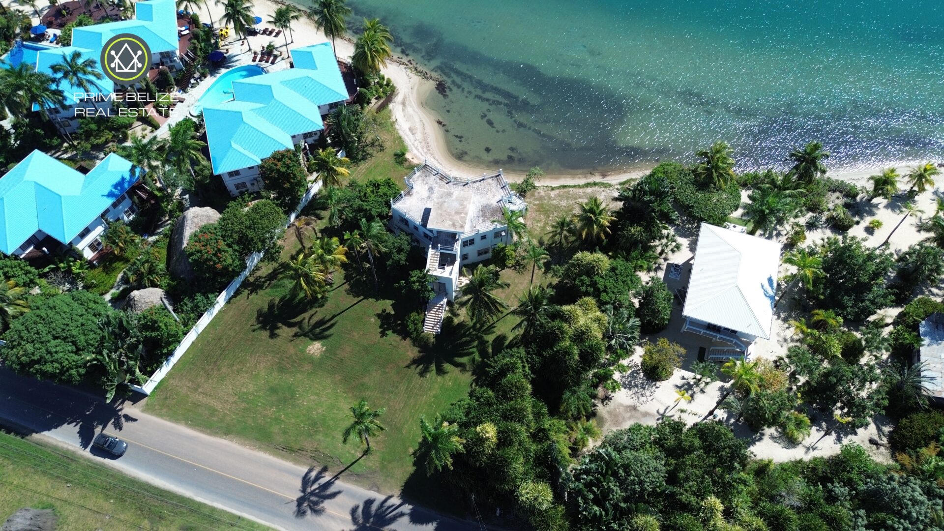 The expansive lot features 166 feet of prime beachfront and extends 232 feet towards the main Placencia road.